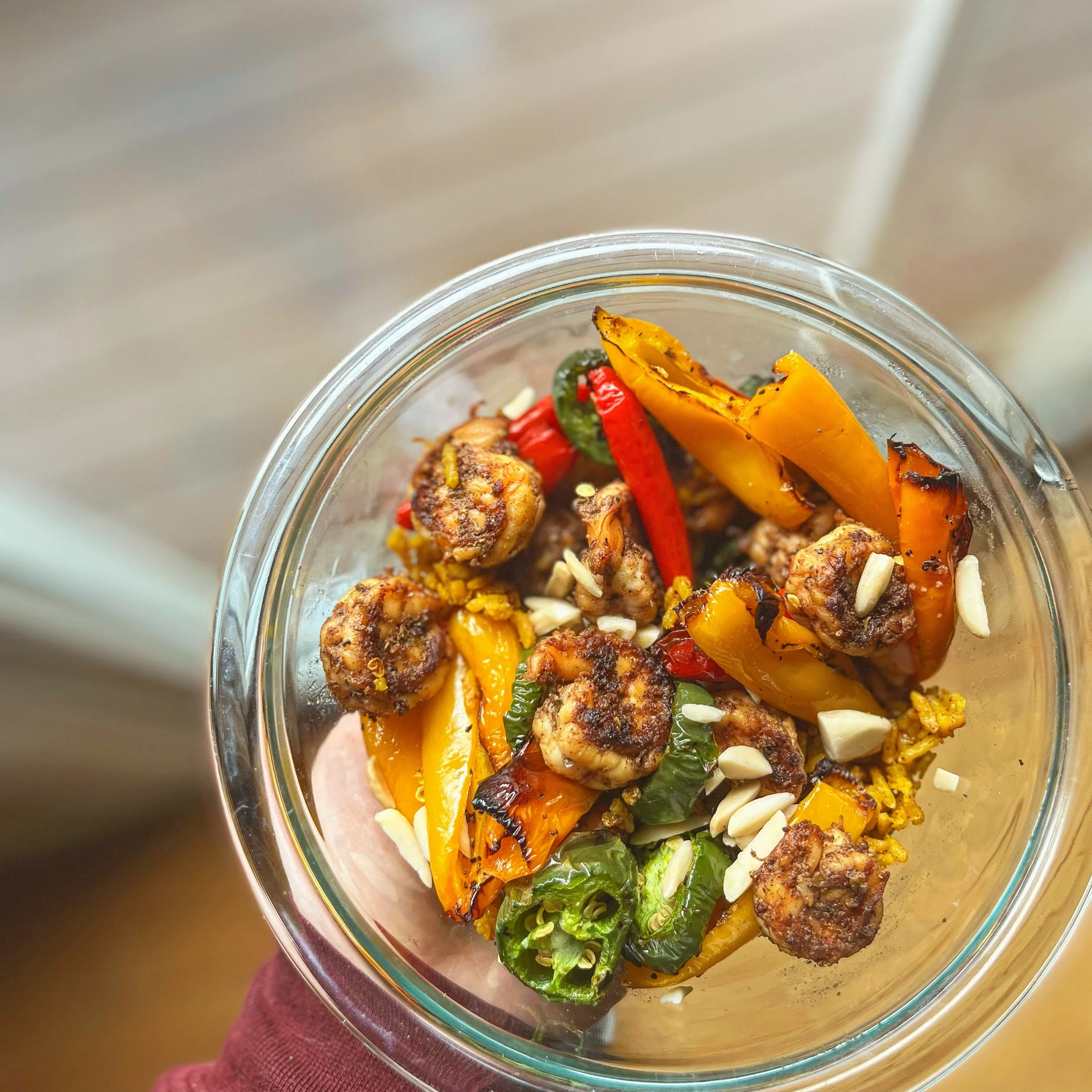 First you wanna marinate the shrimp. Make sure it’s cleaned and dry then place in a medium sized bowl. Add in a light drizzle of olive oil, 1 teaspoon of allspice, 1/2 teaspoon of cardamom, 1/2 teaspoon of cumin, 1/2 teaspoon of black pepper, and 1/2 teaspoon of salt. While the shrimp is marinating, rinse and wash the rice. In a pot that you will be cooking the rice in, heat a light drizzle of olive oil. Once the pot is warm, add in the onion (diced) and sautee for a minute. Next, add in the garlic (diced or pressed) and then the drained rice. Before you add in any liquid, add 1 teaspoon of allspice, 1/2 teaspoon of cardamom, 1 teaspoon of turmeric, and 1/2 teaspoon of black pepper&salt. Mix together until all combined and fragrant. Lastly, add in the slivered almonds and then about 1.75-2 cups of water or chicken broth, cover and simmer on low for about 15-20 minutes. While the rice is cooking, slice the bell peppers and jalapeno to your liking. You can air fry them or bake them until slightly charred at 400-425 Fahrenheit. When the rice is almost done, heat up a pan to about medium heat. Spray with cooking spray or use a small amount of oil. Once the pan is hot, add in the shrimp- cooking time will vary depending on the size of the shrimp. Once everything is done assemble your bowl<3