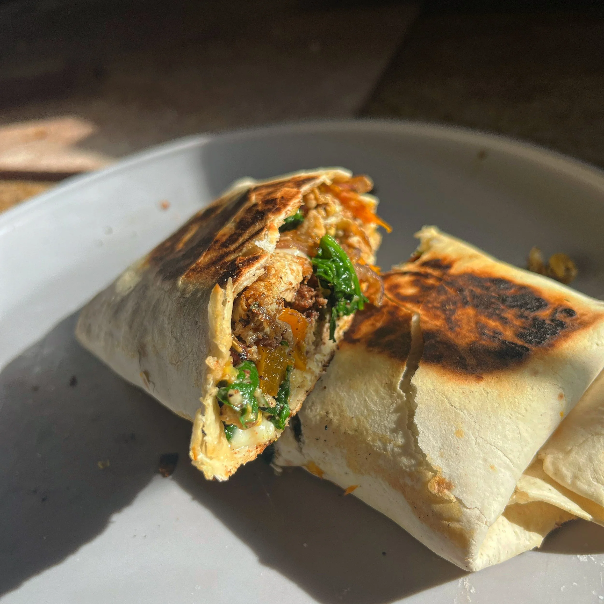 Cook your eggs however you like first. Add your cooked eggs to the tortilla (pro tip: if there’s too much egg in the tortilla, just have some eggs on the side). Finely chop the bell pepper. Add the bell pepper to a pan with a lil oil or some cooking spray and sautee for a few minutes. Once they start to get some color, add in the ground meat and all of the spices and then add in the spinach. Finish off with a few (or a lot) spoons of salsa and cook until..cooked. Add the cooked ingredients to the tortilla, roll it up nice & tight (ayo), and place it back on the pan (might wanna add more cooking spray) and brown on each side to your liking.